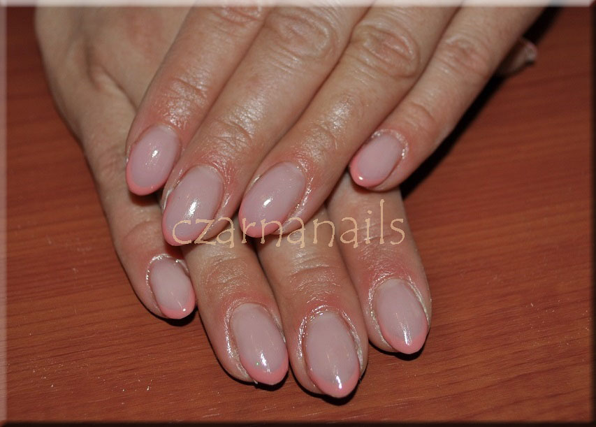 French (gel perfect white 'nails company') cover ('modena') końcówka lakier ('golden rose sweet color' nr 91) i wzorek malowany ręcznie żelem za pomocą sondy ;)